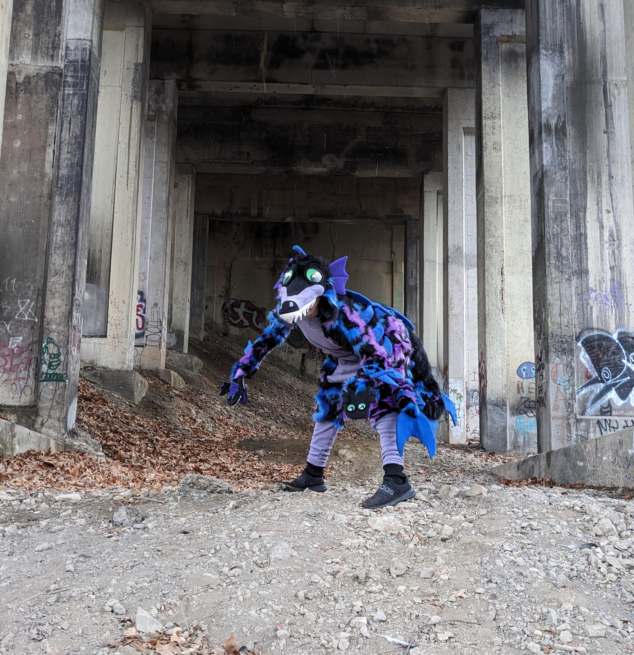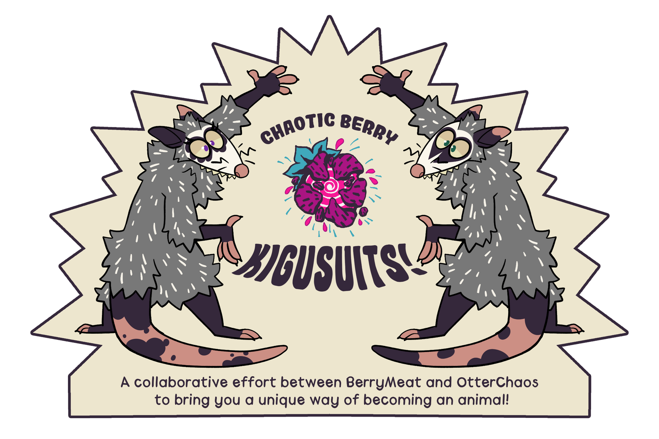 The concept of the Chaotic Berry Kigusuits came to be because we wanted to be fluffy and fuzzy but wanted an option where we could see and breathe easily (so no fursuit head) and have full use of our hands. Thus, the opossums were born! They are the perfect balance of dexterity, comfort, and low maintenance while also having the excitement of being a fuzzy creature!